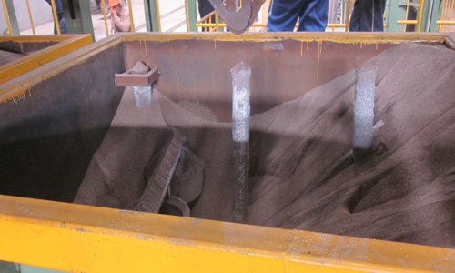 根據(jù)鐵水成分標(biāo)準(zhǔn)要求,加入適量廢鋼、硅鐵,在中頻電爐內(nèi)調(diào)整鐵水成分,直至符合工藝要求。